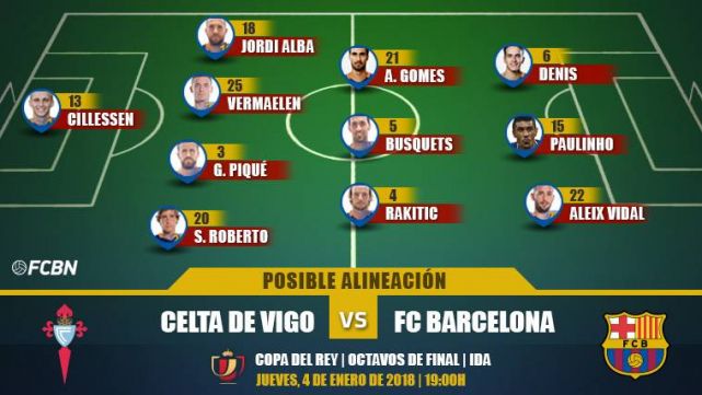 El FC Barcelona disputará este miércoles 4 de enero a partir de las 19:00 horas, el partido de la ronda de octavos de final de la Copa del Rey ante el Celta de Vigo en el estadio de Balaídos. El Celta ya demostró en el partido de Liga Santander en el Camp Nou que es un rival complicado para los azulgranas, ya que consiguieron empatar.