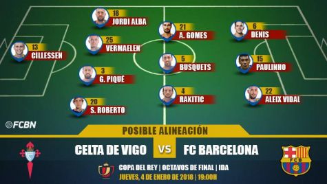 Aleix Vidal volverá a tener su oportunidad ocupando el extremo derecho del ataque azulgrana, mientras que Denis Suárez partiría desde la izquierda. La falta de un delantero centro puro daría mucha importancia a las llegadas desde la segunda línea de los centrocampistas. José Arnáiz también tiene opciones de ser titular en Balaídos.