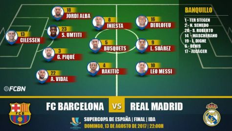 Su rival será un Real Madrid que aterriza en el Camp Nou después de haber doblegado al Manchester United en la Supercopa de Europa, pero con las bajas de Jesús Vallejo y Luka Modric. Ernesto Valverde no podrá contar nunca más con Neymar, y tiene lesionados a Rafinha y André Gomes. Sin embargo, será capaz de aparecer sobre el terreno de juego con un once titular de plenas garantías.