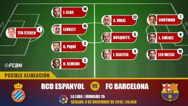 Finalmente, Arthur Melo no se ha recuperado a tiempo para jugar el derbi ante el RCD Espanyol. Se espera que su puesto lo ocupe un Arturo Vidal que está ganando mucho protagonismo en los últimos encuentros, aunque tampoco será descartable que Philippe Coutinho retrasara su posición o que Carles Aleñá tuviese una nueva oportunidad. Sergio Busquets e Ivan Rakitic, eso sí, jugarán seguro.