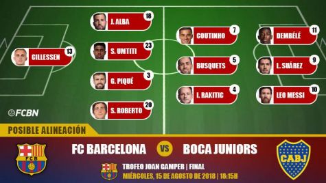 Teniendo en cuenta que es el último ensayo antes de comenzar LaLiga, la lógica invita a pensar que Ernesto Valverde saldrá con todo en el primer tiempo. Sergio Busquets jugaría por delante de la defensa, Ivan Rakitic recuperaría el puesto en el interior derecho y Philippe Coutinho jugaría por la izquierda, en la posición que Andrés Iniesta dejó vacante.