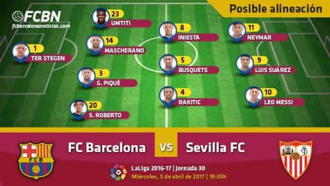 Un duelo donde recuperarán a Leo Messi y Gerard Piqué, ausencia en el anterior enfrentamiento. Quienes no estarán serán los ya conocidos Arda Turan y Aleix Vidal ni tampoco un Rafinha Alcántara que se lesionó al cuarto de hora del duelo ante los andaluces. Su baja deja una importante duda en la alineación del técnico asturiano, que deberá apostar por alguien para cubrir el extremo diestro. Eso siempre en caso de que vuelva a confiar en el 3-4-3, pues podría recuperar su 4-3-3 con Sergi Roberto entrando desde el carril derecho pero aportando más en el centro del campo. Este es el posible once azulgrana: