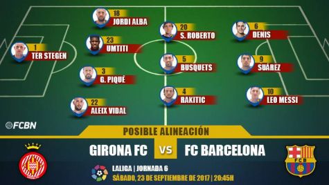 La ausencia de Gerard Deulofeu, al que Ernesto Valverde ha querido quitar presión en la rueda de prensa previa al partido, deja bastante claras sus intenciones contra el Girona. Leo Messi y Luis Suárez parecen las opciones más claras, y la única duda será confirmar quién es su acompañante. El buen rendimiento de Denis en los últimos partidos le sitúa como claro candidato, contando además que ya tiene experiencia en posiciones más adelantadas, pero hay jugadores que también podrían optar al once. Aleix Vidal e incluso Sergi Roberto, el más polivalente de la plantilla, podrían ser alternativas en la delantera.