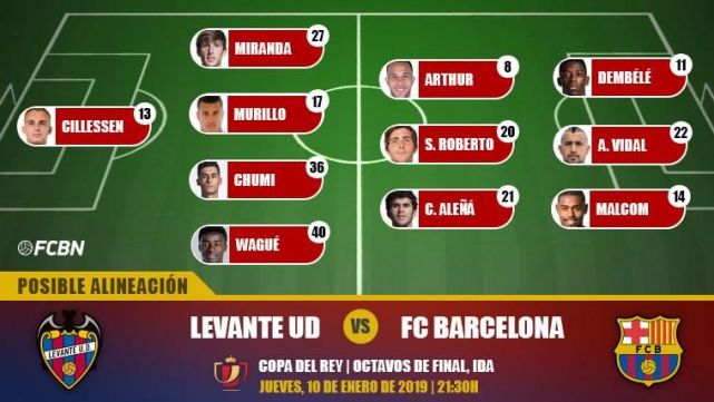 La gran duda es quién actuará como nueve sin Luis Suárez ni Leo Messi, y Valverde ha deslizado que podría ser Arturo Vidal. Esta será la gran prueba en el Ciutat de València, y actúe quien actúe en punta, podría estar flanqueado por extremos más específicos. Lo más esperado sería que el turno fuera para Ousmane Dembélé y Malcom, aunque tampoco sería extraño ver opciones como Denis Suárez o Philippe Coutinho.