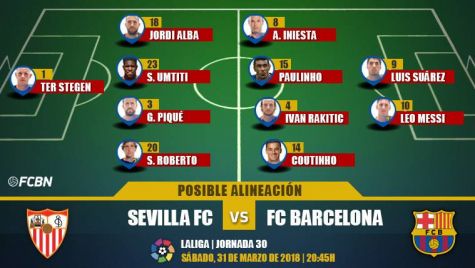 El duelo contra el Sevilla se prevé complicado por el potencial del rival en la medular, con hombres como N'Zonzi o Banega, por lo que no se prevén demasiados experimentos de Ernesto Valverde en el centro del campo. Paulinho e Ivan Rakitic jugarían por delante de la defensa, mientras que Andrés Iniesta y Philippe Coutinho serían sus acompañantes partiendo desde las bandas.