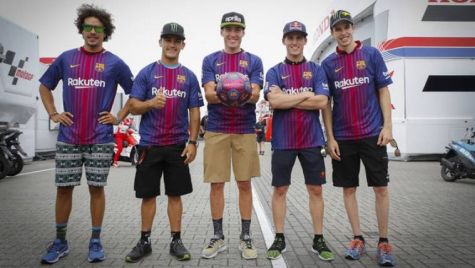 El paddock del circuito de Assen ha tenido presencia destacada azulgrana durante unos instantes y es que los pilotos de MotoGP, Aleix y Pol Espargaró; los de Moto2, Alex Márquez y Franco Morbidelli, así como el de Moto3 Arón Canet -todos ellos seguidores del FC Barcelona- han paseado entre las "motorhomes" del trazado holandés luciendo las camisetas de su equipo con sus nombres en el espalda.