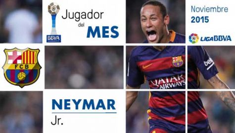 Neymar Jr ha recibido el premio al Mejor Jugador de la Liga BBVA en el mes de noviembre al haber firmado actuaciones espectaculares, anotando cinco goles y convirtiéndose en el único jugador del Barça que ha sido galardonado con dicho premio desde que los creó la LFP