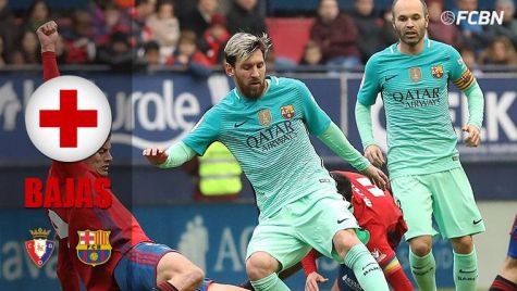 El FC Barcelona y el Osasuna llegan al duelo de esta jornada 34 de LaLiga2016-2017 con muchas ausencias, sobre todo por parte "rojilla". Los de Pamplona han tenido que convocar hasta a cinco jugadores del filial para completar la convocatoria