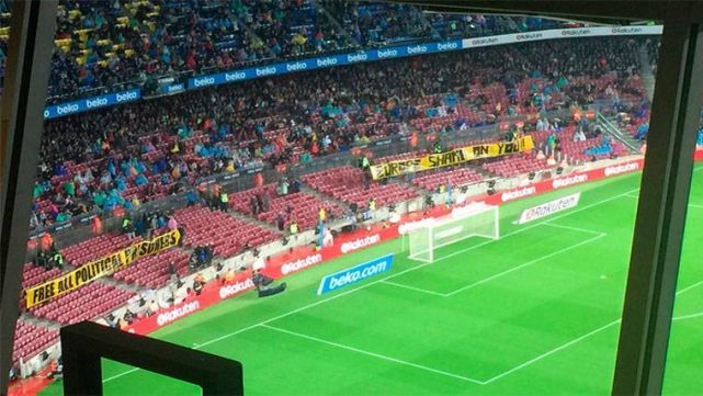 Una parte importante de los aficionados del Camp Nou participó en los distintos actos de reivindicación. Se pudieron ver multitud de pancartas, un tifo y una 'senyera' gigante en distintos puntos de las gradas del estadio del FC Barcelona. Los espectadores se mostraron contrarios a las detenciones del ex vicepresidente de la Generalitat, Oriol Junqueras, y de siete ex consellers.