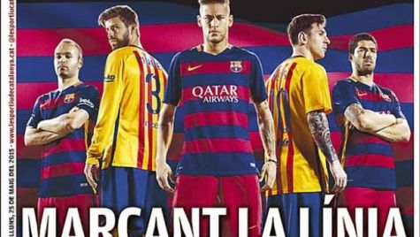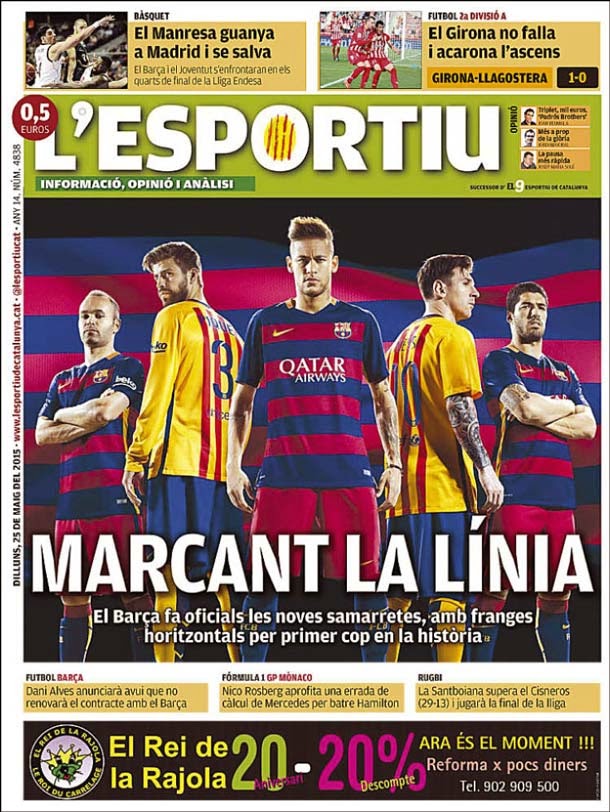 Portada del periódico L´Esportiu, lunes 25 de mayo de 2015. El Barça hace oficiales las nuevas camisetas, con franjas horizontales por primera vez en la historia.