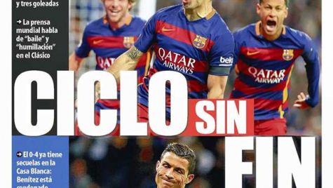 Portada del periódico Mundo Deportivo, lunes 23 de noviembre de 2015. El Barça es el amo del Bernabéu: desde 2009, 7 triunfos y tres goleadas. La prensa mundial habla de "baile" y "humillación" en el Clásico. El 0-4 ya tiene secuelas en la Casa Blanca: Benítez está condenado.