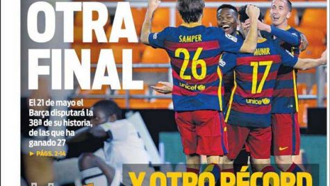 Portada del periódico Sport, jueves 11 de febrero de 2016. El 21 de mayo el Barça disputará la 38ª final de su historia, de las que ha ganado 27. Con 29 partidos sin perder, el equipo de Luis Enrique supera al de Guardiola de la temporada 2010-2011.