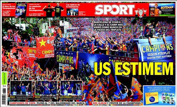 Portada del periódico Sport, lunes 8 de junio de 2015. Barcelona se echó a la calle y el Camp Nou vibró como nunca en la fiesta del triplete.