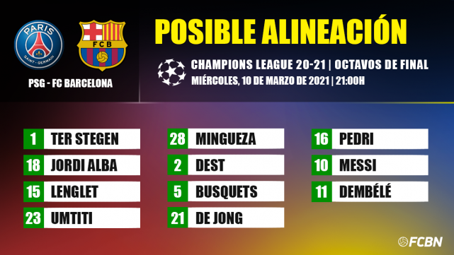 - FC Barcelona: Ter Stegen; Dest, Mingueza, Umtiti, Lenglet, Jordi Alba; Busquets, De Jong, Pedri; Dembélé y Messi.