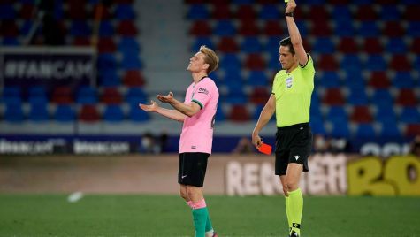 De Jong llevaba catorce partidos jugando. Desde que sumó la cuarta amonestación el pasado 7 de febrero durante la cita de los azulgranas con el Betis, había logrado aguantar y seguir estando a disposición del holandés, pero ayer, Munuera Montero, el árbitro del partido entre el Levante y el Barcelona, se interpuso en su camino.