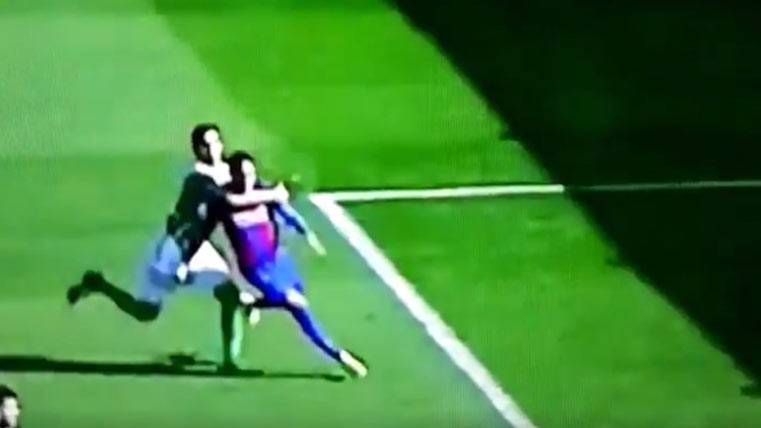 En la jugada del primer gol fantasma, antes de que Jordi Alba rematara al fondo de la portería rival, puede apreciarse cómo Mandi agarra por detrás a Neymar Jr, derribándole e impidiendo que pueda participar en la jugada polémica.