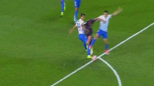 El canterano del FC Barcelona había sido derribado en el interior del área y tanto Gil Manzano como el juez de línea lo vieron, pero a pesar de ello decidieron anular el penalti y señalar una falta al borde del área del Málaga, para desesperación de los jugadores del FC Barcelona.
