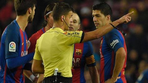 El árbitro del FC Barcelona-Atlético, Gil Manzano, perjudicó gravemente al Barça en la vuelta de semifinales de Copa del Rey 2016-17 al expulsar a Luis Suárez en los últimos minutos por dos jugadas muy rigurosas. Además, se perderá la final