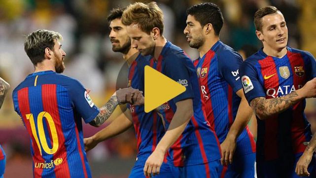 1-0, Luis Suárez (minuto 8): aprovecha un centro de Messi. 2-0, Messi (minuto 10): disparo seco y raso desde la frontal del área. 3-0, Neymar (minuto 17): a la segunda anotó el brasileño. 3-1, Omar Abdulrahman (minuto 51): anota un penalti a lo "panenka". 4-1, Alcácer (minuto 55): cabeceó un buen centro de Rakitic desde la derecha. 5-1, Rafinha (minuto 58): se fue de tres rivales en el área para batir a Al-Rehaili. 5-2, Assiri (minuto 60): el atacante bate a Masip por el palo corto. 5-3, Assiri (minuto 64): marcó a puerta vacía.