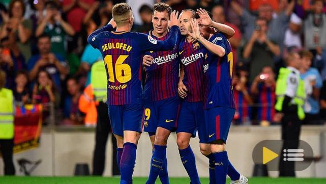 1-0, Deulofeu (min. 2): El de Riudarenes se estrenó en Liga 2017-18 con el FC Barcelona gracias a un gol que no debió subir al marcador, puesto que el balón había rebasado la línea de fondo antes de que Digne centrara. 2-0, Andrés Iniesta (min. 56): El capitán del FC Barcelona recibió un pase de Leo Messi en el interior del área para colocar, con la izquierda, un disparo que rebotó en un defensor y entró por la escuadra.