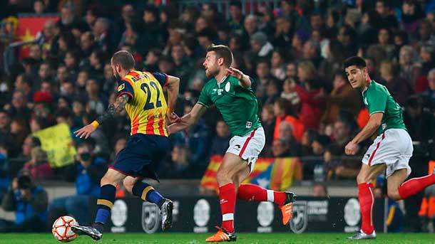 Pero a pesar de salir con una defensa formada exclusivamente por futbolista del conjunto blaugrana (Alba-Piqué-Bartra-Vidal), la selección catalana tuvo que claudicar tras un gol del ariete del Athletic de Bilbao Aritz Aduriz, que sigue demostranto que esta 2015-2016 es su temporada. El nueve vasco fue el más activo en el inicio del partido, pues de sus botas y su cabeza nacían todas las ocasiones de peligro. Aunque fue primero Sergi Roberto el encargado de poner a prueba a Iraizoz, Aduriz tomaría las riendas y en dos acciones seguidas a punto estaría de poner por delante a Euskadi. Lo evitaría un inmenso Pau López con dos intervenciones de gran mérito.
