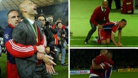 Las redes sociales han convertido en virales unas imágenes de Pep Guardiola captadas por las cámaras de televisión durante la final de la Copa de Alemania entre Bayern Múnich y Borussia Dortmund. El de Santpedor realizó un curioso masaje a Franck Ribéry cuando éste estaba agachado en el suelo, y terminado el partido celebró el título con Boateng y el extremo francés. Múltiples bromas se han realizado ya por los usuarios en torno a las imágenes, que algunos habrían aprovechado para mofarse del técnico.