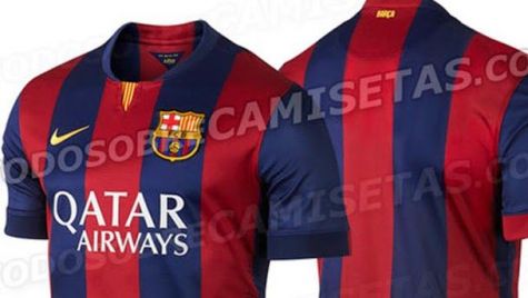 La web "todosobrecamisetas.com" ha revelado cómo será la primera equipación oficial del FC Barcelona para la temporada 2014-15. El cuello será azul y por detrás podrá leerse "Barça". La camiseta tendrá tres franjas granates y dos azules, sin muchos cambios