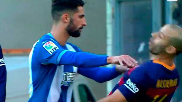 Después de esto, apareció por la zona Sergi Busquets para defender a su compañero y, tras forcejear con el jugador espanyolista, éste acabó también tumbado sobre el terreno de juego. Finalmente el árbitro acabó amonestado a Javier Mascherano por una parte y a Álvaro por otra para tratar de contentar a ambas partes.