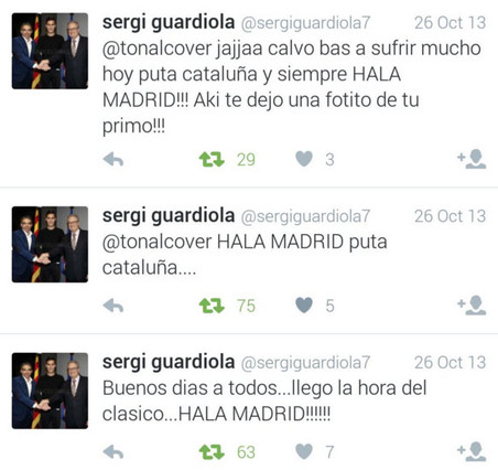 Horas después el jugador trató de defenderse en el programa televisivo "El Chiringuito", afirmando que los tuits no los había escrito él. A pesar de su defensa, parecía que sí que los había realizado él a tenor de sus siguiente palabras en el programa: "Quería pedir pedrón a Catalunya y al Barcelona. Me he equivocado". Guardiola añadía que "mi familia está fastidiada", pero a su vez "entiendo la decisión del Barça. Si hubiera sido el Barça, habría hecho lo mismo".