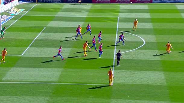 Como puede verse en la imagen que acompaña la noticia, un jugador de la defensa levantinista rompía el fuera de juego de Messi, que recibía un pase perfecto de Andrés Iniesta desde la frontal del área visitante. El manchego se inventaba una asistencia de mago que le llegaba a Leo, quien recibía y ante la salida de Mariño le batía por bajo en una excelente acción.