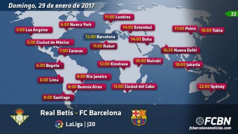 En África, el partido de la vigésima jornada de la Liga española de fútbol entre el Betis y el FC Barcelona podrá verse en directo a través de SuperSport 12, SuperSport Maximo 3 y SuperSport 7. Y en los Países Árabes, en beIN Sports Arabia 3 HD, beIN Sports Arabia 17 HD, beIN Sports Arabia 13 HD y beIN SPORTS CONNECT Arabia.