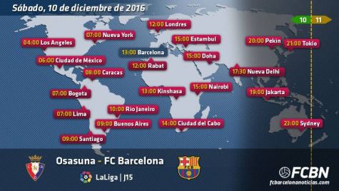 En África, el partido de la 15ª jornada de la Liga española de fútbol entre el Osasuna y el FC Barcelona podrá verse en directo a través de SuperSport 12, SuperSport Select 2, SuperSport Maximo 3 y SuperSport Select 2 Go. Y en los Países Árabes, en beIN Sports Arabia 17 HD, beIN Sports Arabia 12 HD y beIN Sports Arabia 3 HD.
