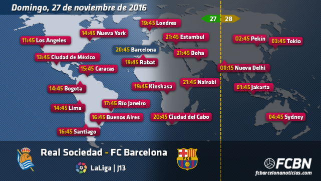 En Europa, el partido entre la Real Sociedad y FC Barcelona podrá verse en directo a través de los siguientes canales y horarios: