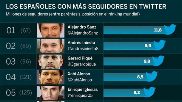 En cuanto al número de seguidores, hasta cinco jugadores españoles con presente o pasado azulgrana ocupan las primeras posiciones de la lista. Andrés Iniesta es el segundo español, primer deportista, con más seguidores en Twitter con 9,9 millones. Muy cerca, en la tercera posición general, le sigue otro azulgrana: Gerard Piqué. El central catalán tiene 9,8 de seguidores en la popular red social. El siguiente es el ex jugador del Barça Cesc Fàbregas (7,4), quien ocupa la sexta posición. Carles Puyol (7,3) es séptimo y David Villa (6,7), décimo.