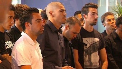 Carles Puyol, Xavi Hernández, Andrés Iniesta y Víctor Valdés, los cuatro capitanes, han encabezado la plantilla. El portero iba con muletas. Con el grupo también estaba el presidente del club, Josep Maria Bartomeu, el director deportivo, Andoni Zubizarreta (especialmente afectado), y el directivo responsable del área de fútbol, Jordi Mestre. Las lágrimas de Andoni Zubizarreta o los rezos de Dani Alves han dejado entrever cómo ha afectado la noticia a una plantilla hundida.