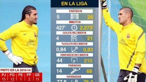 Pinto ya demostró este miércoles contra el Celta de Vigo que es capaz de hacer buenas actuaciones y paradas espectaculares. En el minuto 52 protagonizó una meritoria doble parada a Augusto Fernández y Orellana que levantó al público del Camp Nou y le obligó a corear su nombre. Tanto el andaluz como Víctor Valdés han recibido 0,83 goles por partido, mientras que Víctor Valdés ha realizado un 76,4% de paradas y el gaditano un 77,8%, siendo mejor en este apartado. Durante el curso 2013/14, José Manuel Pinto ha disputado 5 compromisos de Liga, 8 de Copa del Rey y 2 de Champions League y ha encajado once goles.