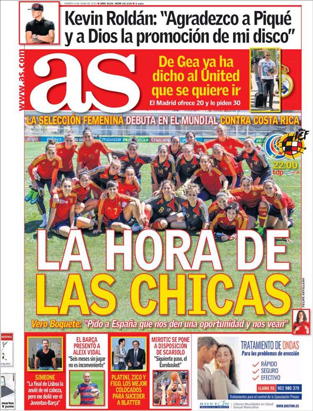 Portada del periódico As, martes 9 de junio de 2015. La selección femenina debuta en el Mundial contra Costa Rica. Vero Boquete: "Pido a España que nos den una oportunidad y nos vean".