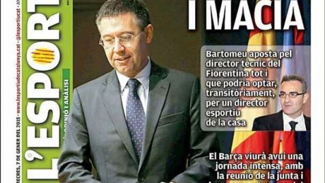 Portada del periódico L´Esportiu, miércoles 7 de enero de 2015. Bartomeu apuesta por el director técnico de la Fiorentina aunque podría optar, transitoriamente, por un director deportivo de casa.