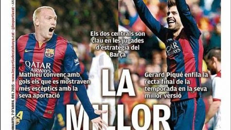 Portada del periódico L´Esportiu, martes 7 de abril de 2015. Los dos centrales son clave en las jugadas de estrategia del Barça. Matiheu convence con goles a los que se mostraban más escépticos con su aportación. Piqué encara la recta final de la temporada en su mejor versión.