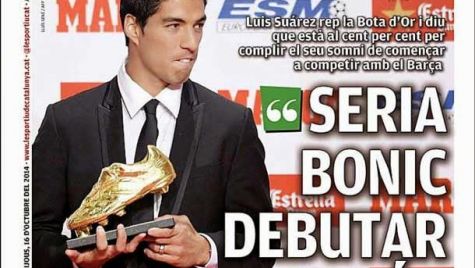 Portada l´Esportiu, jueves 16 de octubre de 2014. Luis Suárez recibe la Bota de Oro y dice que está al cien por cien para cumplir su sueño de comenzar a competir con el Barça.