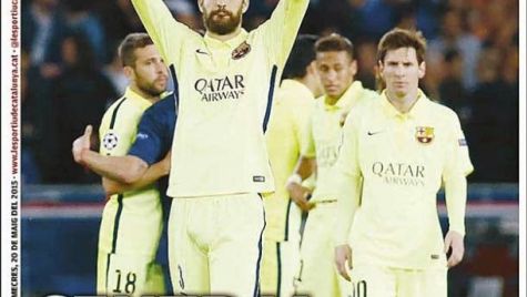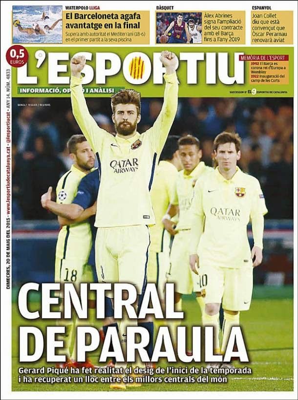 Portada del periódico L´Esportiu, miércoles 20 de mayo de 2015. Gerard Piqué ha hecho realidad el deseo de inicio de temporada y ha recuperado un lugar entre los mejores centrales del mundo.