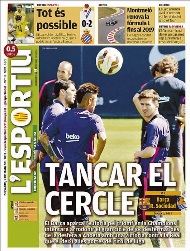 Portada del periódico L´Esportiu, sábado 9 de mayo de 2015. El Barça aparca la euforia por el triunfo en la Champions e intentará redondear el gran ciclo de juego desde la derrota en Anoeta con una victoria frente a la Real Sociedad que le deje en las puertas del título.