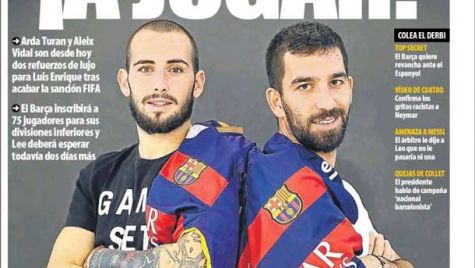 Portada del periódico Mundo Deportivo, lunes 4 de enero de 2016. Arda Turan y Aleix Vidal son desde hoy dos refuerzos de lujo para Luis Enrique tras acabar la sanción FIFA. El Barça inscribirá a 75 jugadores para sus divisiones inferiores y Lee deberá esperar todavía dos días más.