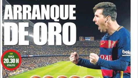 Portada del periódico Mundo Deportivo, domingo 17 de enero de 2016. El Camp Nou alberga hoy el primero del intenso tríptico de duelos entre Barça y Athletic de Bilbao. Bonus track: Leo Messi ofrecerá a la afición su flamante quinto Balón de Oro (20:30h).