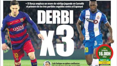 Portada del periódico Mundo Deportivo, sábado 2 de enero de 2016. El Barça empieza un enero de vértigo jugando en Cornellà el primero de los tres partidos seguidos contra el Espanyol.