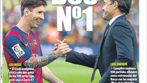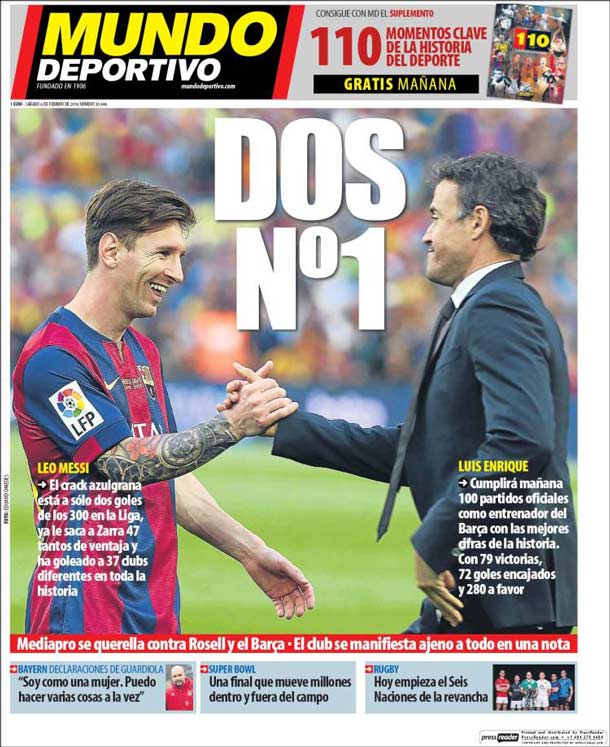 Portada del periódico Mundo Deportivo, sábado 6 de febrero de 2016. Leo Messi está a sólo dos goles de los 300 en la Liga, ya le saca a Zarra 47 tantos de ventaja y ha goleado a 37 clubs diferentes en toda la historia. Luis Enrique cumplirá mañana 100 partidos oficiales como entrenador del Barça con las mejores cifras de la historia. Con 79 victorias, 72 goles encajados y 280 a favor.