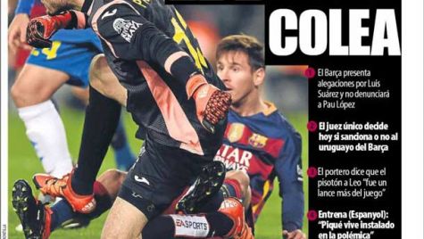 Portada del periódico Mundo Deportivo, viernes 8 de enero de 2016. El Barça presenta alegaciones por Luis Suárez y no denunciará a Pau López. El juez único decide hoy si sanciona o no al uruguayo del Barça. El portero dice que el pisotón a Leo "fue un lance más del juego".