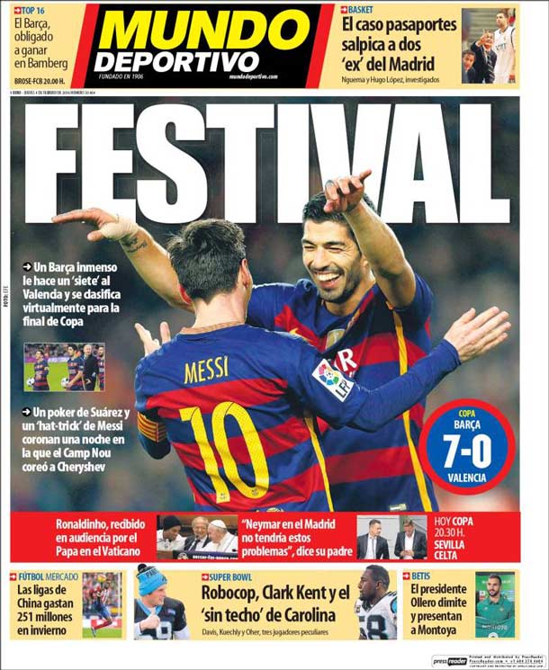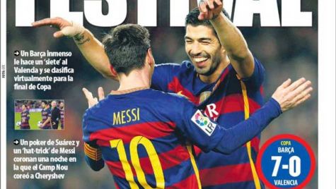 Portada del periódico Mundo Deportivo, jueves 4 de febrero de 2016. Un Barça inmenso le hace un "siete" al Valencia y se clasifica virtualmente para la final de Copa. Un poker de Suárez y un "hat-trick" de Messi coronan una noche en la que el Camp Nou coreó a Cheryshev.