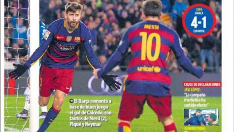 Portada del periódico Mundo Deportivo, jueves 7 de enero de 2016. El Barça remontó a base de buen juego el gol de Caicedo, con tantos de Messi (2), Piqué y Neymar. El partido estuvo marcado por acciones poco deportivas y el Espanyol acabó con nueve.