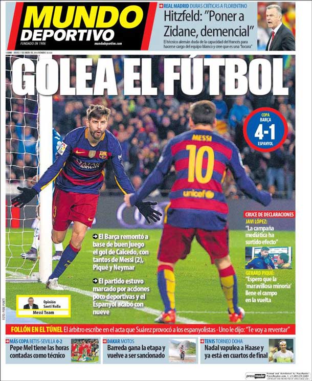 Portada del periódico Mundo Deportivo, jueves 7 de enero de 2016. El Barça remontó a base de buen juego el gol de Caicedo, con tantos de Messi (2), Piqué y Neymar. El partido estuvo marcado por acciones poco deportivas y el Espanyol acabó con nueve.